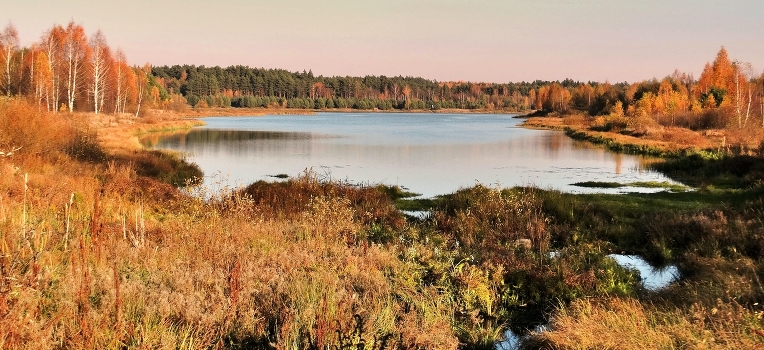 Панорама на осеннее озеро в Орловском Полесье