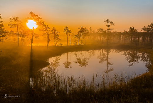 Туманный рассвет на болотно-озёрном комплексе. Из фотопроекта «Магия Ленинградской области».
