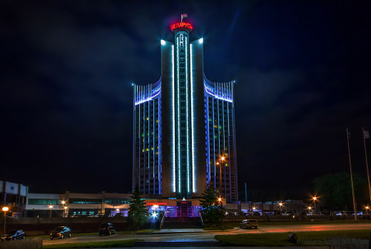 Вечернее фото гостиницы "Беларусь" на проспекте Победителей в Минске.