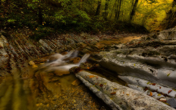 Ущелье , горная речка , каменные слои . Выдумки природы .