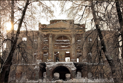 ..Дворец в Пущине - яркий образец русского палладианства с его характерными чертами: греческий портик под низким фронтоном, полукруглые трехчастные окна, итальянские арки в цокольной части и т.п. Создателем архитектурного великолепия в этой усадьбе был предположительно Н.А.Львов, чья приверженность палладианству широко известна. Первоначально к главному дому примыкали 4 флигеля прямоугольной формы, во второй половине XIX века к ним пристроили портики с фронтонами. Парадный двор, ограниченный домом и флигелями окружали кусты акаций. С другой стороны открывался прекрасный вид на реку Нару, к ней спускались и липовые аллеи регулярного парка.