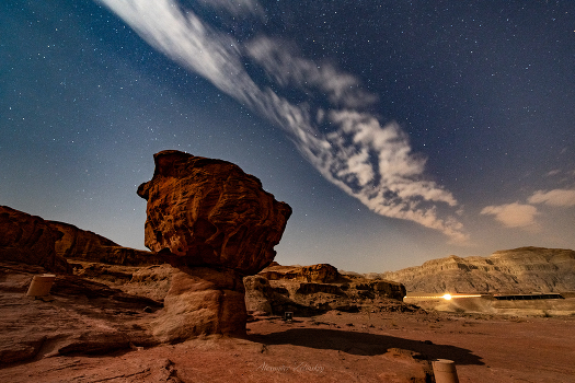 Скала Гриб в долине Тимна. С этого ракурса совсем не гриб, скорее медвежонок или чебурашка. Огни вдалеке - это группа израильских фотографов, участников фестиваля Planet Arava, который в эти дни там проводился. К счастью я их опередил, и мы друг другу почти не мешали.