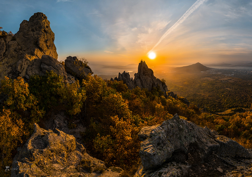 Козьи скалы на Бештау. Осенний рассвет. Справа гора Машук.