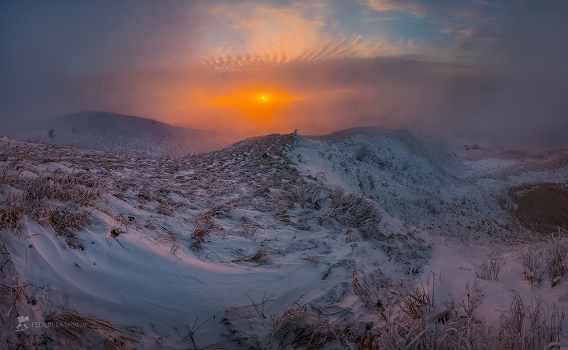 Зимняя степь на юго-западном склоне горы. Был туманный вечер, с очень сильным ветром. К закату солнце наконец-то пробилось, озаряя пейзаж картинным светом.