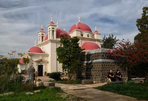 В Капернауме, согласно Евангелиям, проходила основная проповедническая деятельность Иисуса Христа. Тогда город представлял собой рыбачий поселок и таможню на пути из Кесарии в Дамаск[1]. В Капернауме Иисус обрёл своих апостолов — Петра, Андрея, братьев Зеведеевых Иоанна Богослова и Иакова и Левия Матфея. Во II веке в Капернауме образовалась община евреев, перешедших в христианство. В следующем столетии в городе была построена церковь, и он стал оплотом христианства в районе.Греческая церковь Собора Двенадцати Апостолов. Построена в 1930-х годах на части территории евангельского Капернаума. Выполнена в традиции церквей островной Греции, состоящий из кубов и куполов в виде полусфер. Однако, в отличие от собственно Греции, где купола обычно красят в синий цвет, здесь они оказались красными. Это превратило небольшую церковь в яркую цветовую доминанту панорамы. Территория монастыря интересна не археологическими раскопками, а царящей здесь атмосферой патриархального поместья с полузапущенным, но по-южному богатым садом с павлинами. Убранство церкви непривычно яркое и радостное.