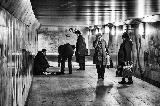 человек очень преклонного возраста даёт на хлеб молодому поэту...