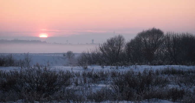 Январский закат в поле у реки.