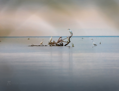 Белые цапли и кудрявый пеликан. Из осенней фотоэкспедиции по Астраханскому заповеднику. Фотопроект «Дельта Волги». Середина октября, 2018 г.