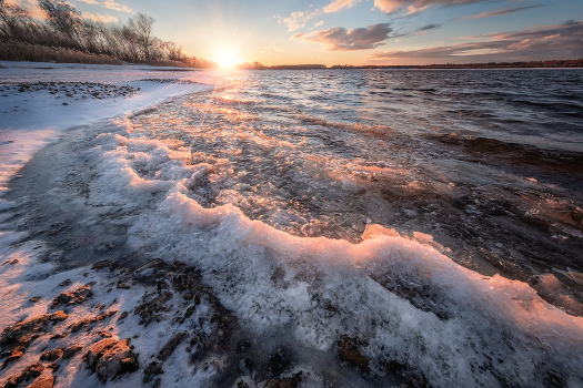 Ледяная шуга у кромки берега негромко шелестит в такт волнам.