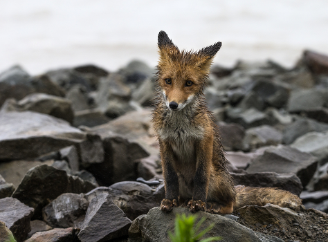 Лисенок. Сахалин. побережье Охотского моря. Крупные камни, ничего съедобного и противный дождь. Попробуй тут выживи.