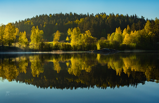 В начале июня на Ладожских островах наконец-то появляется весенняя листва. Листва нежных оттенков зелёного, жёлтого, будто осень. Берёзы и осины вспыхнули светом весны на фоне тёмных сосен.