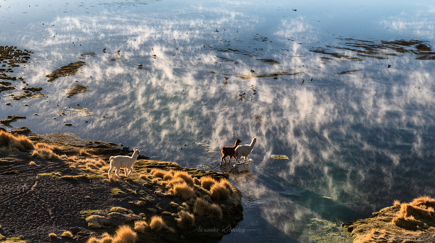 Горячие ключи впадают здесь в соленое высокогорное озеро. Под водой скрыты пастбища сочной зеленой травы, куда стремятся все обитатели этих пустынных мест.На заднем плане - андские гуси. Национальный заповедник фауны Андов "Эдуардо Авароа", Альтиплано, Боливия