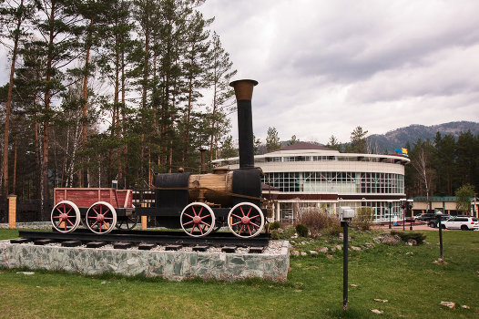 Паравозик стоит возле турбазы в Горном Алтае