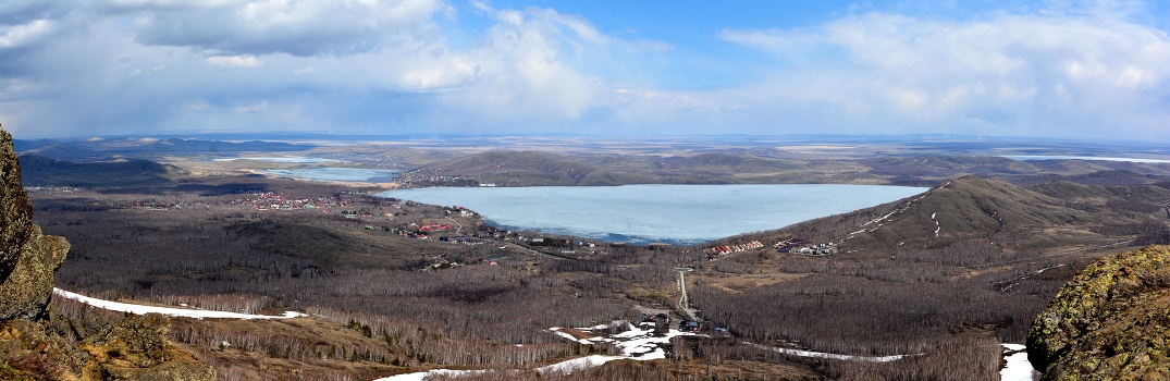 Башкирия. Вид с вершины хребта Яманкай на озеро Банное ( Яктыкуль) и ряд других озёр.
