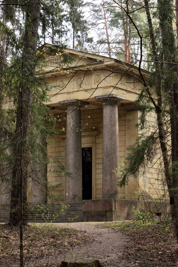Мавзолей «Супругу-благодетелю»...Мавзолей Павла (первоначальное название Храм Павла I или Памятник Павлу I) был сооружен по проекту Ж.Тома де Томона в парковом районе Новой Сильвии .Строительство велось с 1806 по 1810 год. Здание построено в виде древнеримского храма-простиля. Величественное здание из песчаника высится на гранитном подиуме с широкими ступенями, четырехколонный портик поддерживает фронтон с надписью: «Супругу благодетелю», на противоположной стороне – слова: «Павлу I-му Императору и Самодержцу Всероссийскому. Родившемуся сентября 20-го дня 1754 года. Скончавшемуся марта 11-го дня 1801 года». Во фризе изображены плачущие маски.