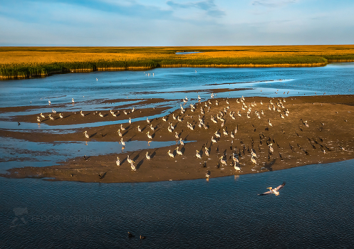 Уже на закате, птицы устраиваются на ночёвку, выбрав удобный песчаный остров, или отмель.