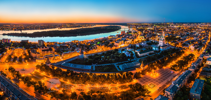 Кремль, будто корабль без огней, плывёт в золотом городе. На горизонте светлая лента реки Волга.