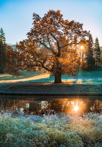 Осенний, морозный рассвет в конце октября. Лёгкий иней на берегу реки Славянка. Воздух чистый-чистый. Санкт-Петербург. Парк Павловск.