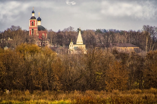 ВИД НА ХРАМЫ (ПЕТРОПАВЛОВСКИЙ - СЛЕВА И НИКОЛЬСКИЙ, БЫВШИЙ ПЕТРОВСКИЙ - СПРАВА) В УСАДЬБЕ ПЕТРОВСКОЕ, НЕДАЛЕКО ОТ ЛЫТКАРИНО, МОСКОВСКОЙ ОБЛАСТИ.