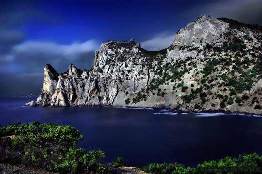 Крым, фото Новый-Свет ночью в свете луны. Голубая бухта, царский пляж, скала Караул-Оба