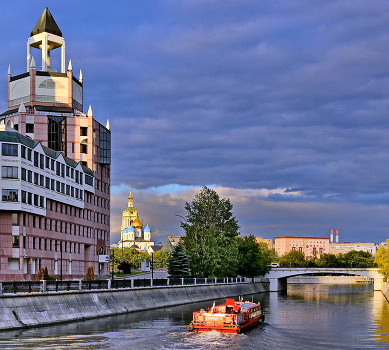 Космодамианская набережная и Водоотводноой канал ( проложен в 1783—1786) Слева одна из "башен" офисного центра Riverside Towers. На заднем плане Новоспасский монастырь.
