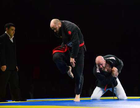 Слева: Боец Александр Чистов (Калининград) смог вырваться из захвата самого многократного чемпиона мира по джиу- джитсу Джеффа Монсона, взлетев как гимнаст! (г. Уфа, международный турнир "Кубок Евразии")