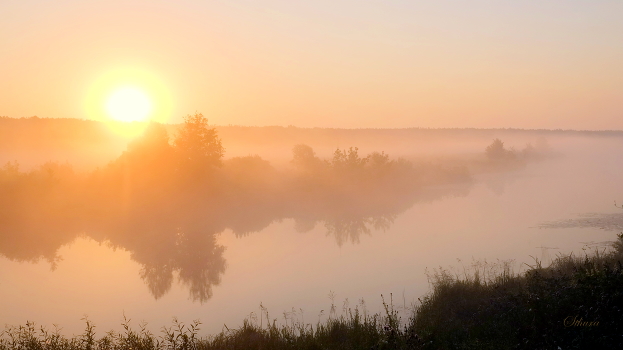 Озеро Сосновое окутано туманом.