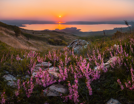 Солнце садится за Сенгилеевское озеро. На переднем плане цветущий миндаль низкий в степи Ставропольской возвышенности.