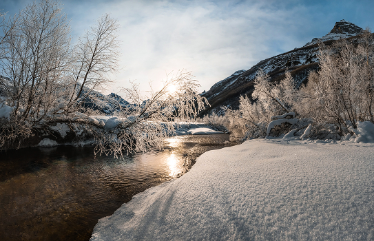 Серебро зимы в контурный свет. Река Клухор. Гоначхирское ущелье. Домбай. Тебердинский природный биосферный заповедник. 21 декабря, 2019 г. Фотопроект «Кавказ без границ».