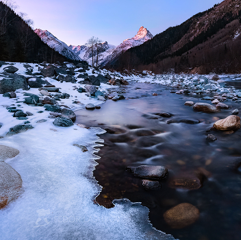 Зимняя заря. Река Аманауз и гора Белалакая. Домбай. Декабрь, 2019 г. Фотопроект «Кавказ без границ».