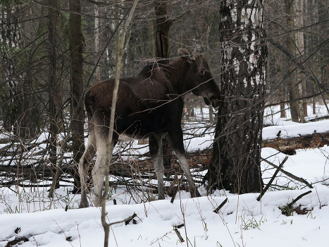 Нынешней малоснежной зимой лоси передвигаются без проблем даже в последний зимний месяц.
