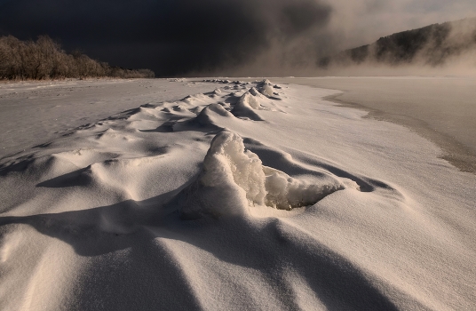 Лед по берегу Енисея в мороз.