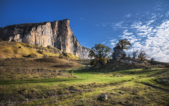 Урупский район Карачаево-Черкессии, октябрь. Ахмет-Гора (1313,7 м) - наивысшая точка длинной семикилометровой куэсты под общим названием Ахмет-Скала, расположенного в западной части Скалистого хребта на административной границе Карачаево-Черкесии с Краснодарским краем. Высота скальных обрывов куэсты местами превышает 200 м. Окрестности горы весьма живописны и фотогеничны, а сама она популярна у скалолазов и BASE-джамперов. Моя палатка вписалась в антураж и я решил не затирать ее.