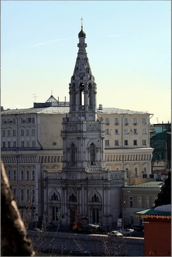 Надвратный храм иконы Богоматери Взыскание погибших...Отдельно стоящая трехъярусная шатровая колокольня была построена в 1860-х годах по проекту архитектора Н.И. Козловского. Нижний этаж монументального первого яруса в центре имеет сквозной проезд на церковный двор, на втором – храм . Второй ярус – четверик. На третьем ярусе – восьмерике – размещаются колокола. он увенчан шатром с главкой и крестом. Колокольня, построенная в русско-византийском стиле, соперничала по высоте с завершенным в 1859 году храмом Христа спасителя.