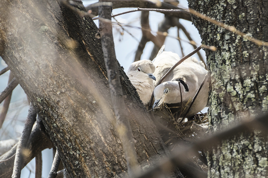 Кольчатые горлицы делают последние штрихи в строительстве гнезда. Россия. Тула.