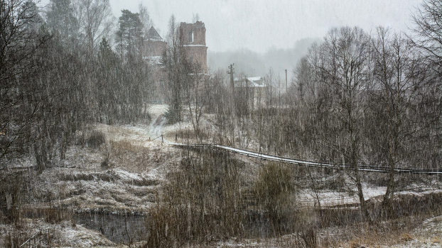 Пейзаж с мостом и старыми постройками в непогоду