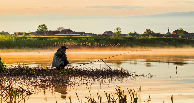 Рыбак на утренней заре. Озеро Исток у посёлка Белоомут, Московская область.