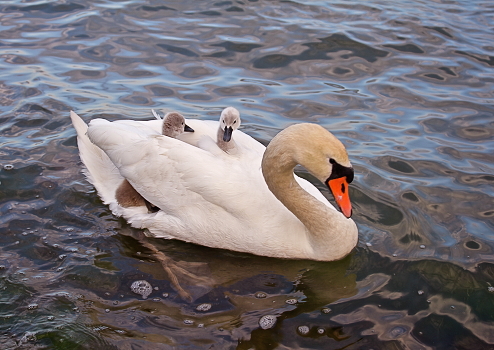 Птенцы в возрасте до 10 дней часто отдыхают на спине у плавающих родителей под их слегка приподнятыми крыльями. Лебедь-шипун
