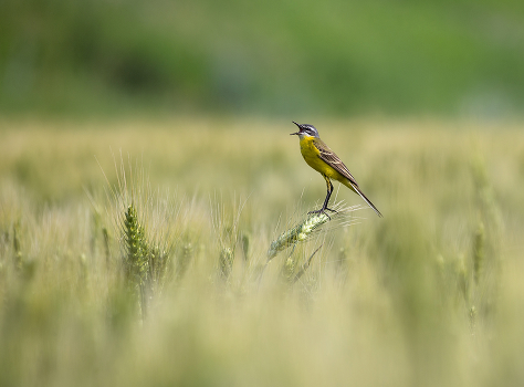 Желтая трясогузка среди колосков пшеницы