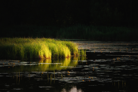 Evening sun rays on the grass growing in the swamp.