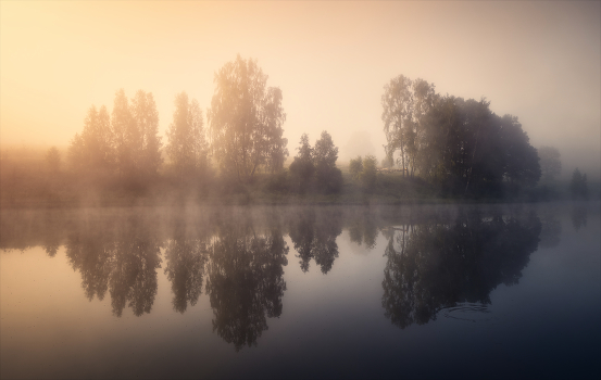 Рассвет на лесном озере.