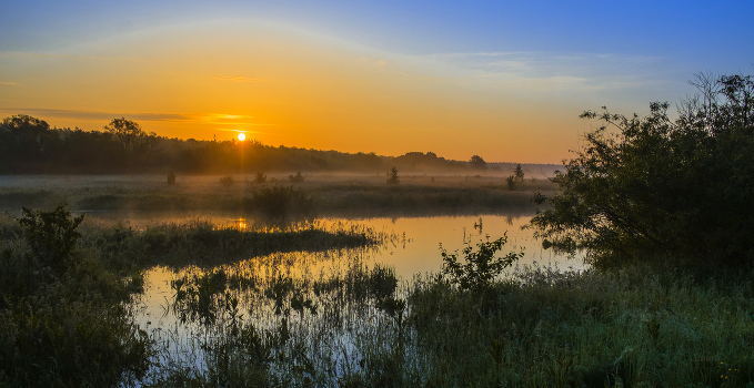 После сильных дождей вода в озёрах и реке поднялась и вышла на поля. Мещера, юго-восток Московской области.