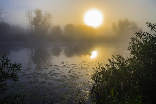Летний, утренний туман на озере Студёное. Мещера, юго-восток Московской области.