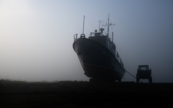 Тайны тумана.. катер ведет на веревочке трактор..