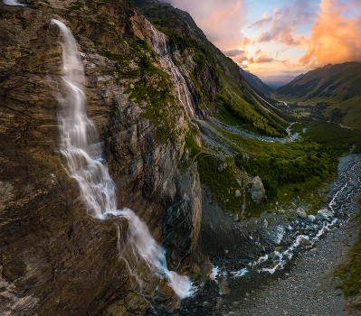 Летний закат. Один из каскадов водопада с видом на Софийскую долину. Начало августа, 2020 год. Фотопроект «Кавказ без границ».