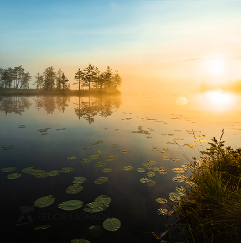 Туманное утро на озере с листьями кувшинок. Из фотопроекта «Магия Ленинградской области».