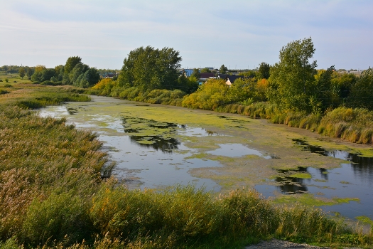Осень. Сентябрь. На снимке сельский пруд на берегах которого деревья и камыш начал слегка по осеннему желтеть.