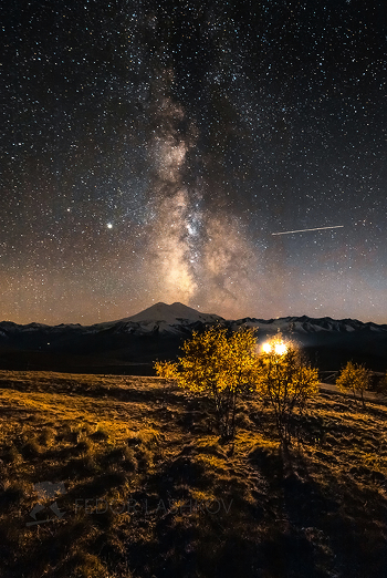 Осенняя ночь с миллиардами звёзд над Кавказским хребтом с двуглавым Эльбрусом. И золотые хрупкие берёзки, освещённые фарами проезжающих машин с близлежащей дороги в Джилу-Су.