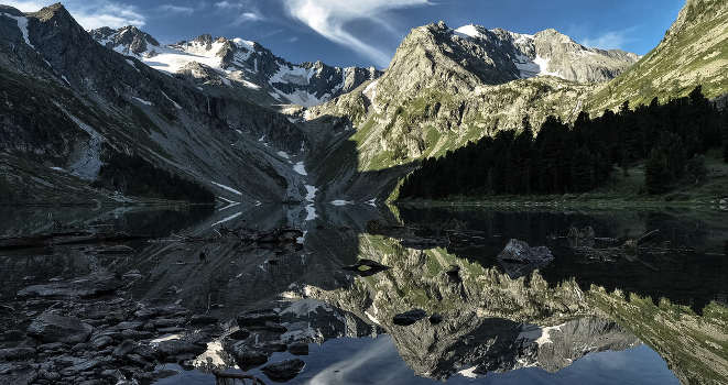 Верхнее Мультинское озеро.Посещение Верхнего Мультинского озера возможно только при наличии пропуска. Оформить документы можно на кордоне заповедника,на тропе встречались медвежьи следы.. но их мы видели только на обратном пути, так как вышли на озеро по темну, чтоб увидеть рассвет.Само озеро небольшое, форма озера вытянутая в меридиональном направлении.Склоны гор с громадными россыпями, небольшие опушки леса внизу и белые шапки снега и льда на остроконечных вершинах - все это отражается на водной глади этого красивейшего озера Алтая.