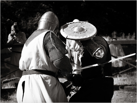 Сила ударов такова, что у одного из бойцов не выдерживает и ломается меч. Вот он - еще висит в воздухе, но через долю секунды эта двухкилограммовая железяка шлепнется на землю в метре от меня, лежащего на земле. Еще пару секунд я снимал серию про то, как боец продолжает махать рукояткой, еще не поняв что случилось. Затем скосил глаза на эту пусть и тупую, но очень увесистую железку, лежащую совсем рядом со мной, и мысленно почесал в затылке - так ли уж мне нужна нижняя точка съемки :)